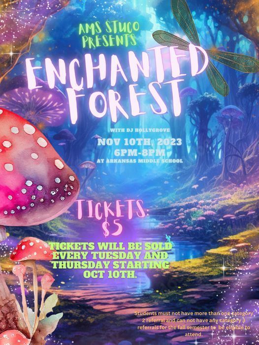 Arkansas Middle School STUCO presents Enchanted Forest, November 10th from 6:00 - 8:00 PM. Tickets are $5.00. The attire is semi-formal.