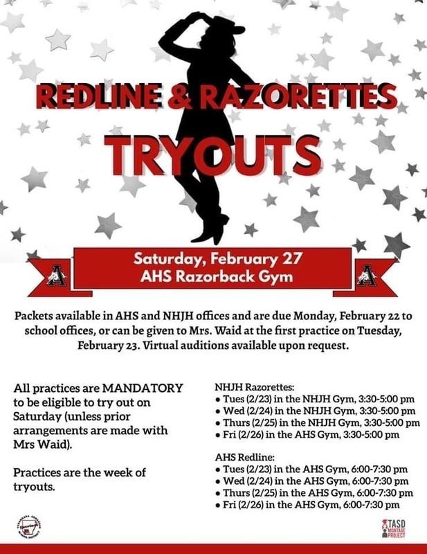 Packets available in AHS and NHJH offices and are due Monday, February 22 to school offices, or can be given to Mrs. Waid at the first practice on Tuesday, February 23. Virtual auditions available upon request.
